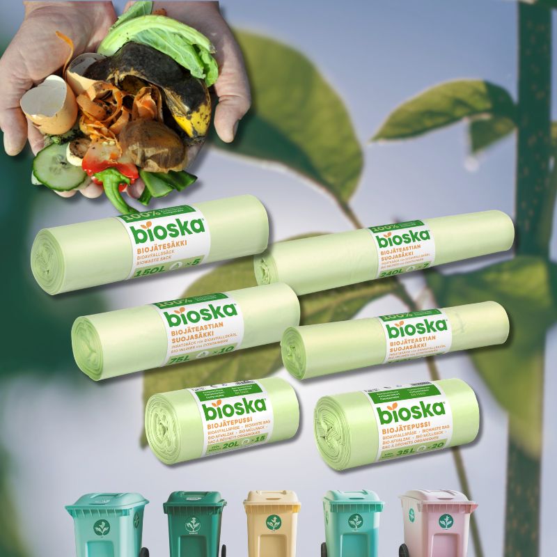 Tuotteet on suunniteltu kestämään arjen vaatimukset, mutta samalla ne hajoavat luonnollisesti kompostoinnissa ilman haitallisia jäämiä. Näin ne tukevat vastuullista kuluttamista ja kiertotaloutta. Bioska-tuotteilla biojätteen lajittelu on vaivatonta, hygieenistä ja ekologista.